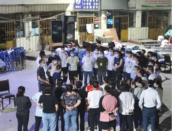 会后,全体志愿者到达临时驻地,立即投入到卫生清理,搬运生活和防疫物资,分区设置住宿点,搭建物资存储间的工作中,全体参战同志不怕苦、不怕累、不怕脏,分工明确,以最短的时间圆满完成工作任务。下午17点,分队接到牌楼街道第一个任务,委派18名队员分成三组全天候值守三个卡点。临时党支部立即召集全体队员开会研究,快速完成人员调配分组,指定小组负责人,防疫生活物资准备等工作。晚上20:20将值守人员送到点位开展值。