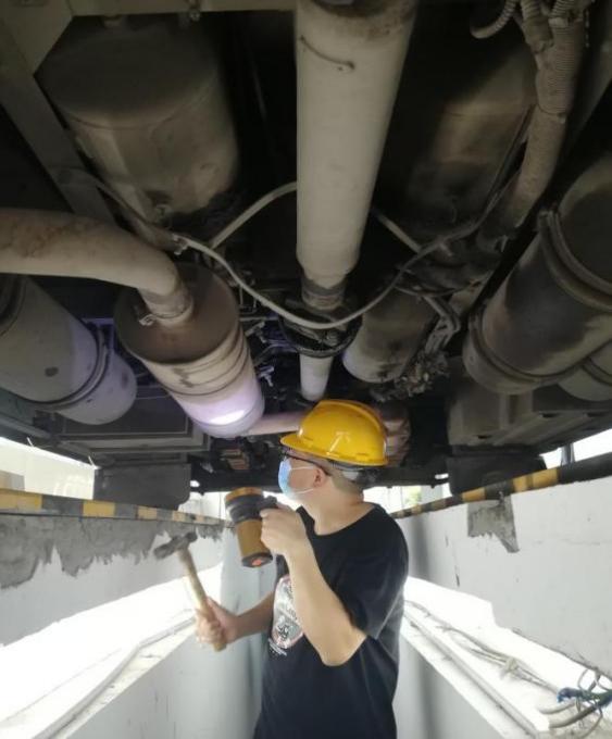 一把榔头只为坚守源头安全。在车站车辆例检处,例检员刘海正在烈日下作业,滚烫的水泥地面、发热的客车底盘和客车尾气让车辆例检台温度更高。刘海不停地在车辆底部钻进钻出,从灯光、转向、制动、底盘,到车胎、螺丝、安全带、消防锤等,认真检查着每一个车辆部件。客车底部的高温让他下去一次便全身湿透一次,脸上的汗也顺着头发往下滴落。说起自己的工作,刘海认为虽然工作环境恶劣一些,但是与售票员、检票员并没有什么不一样,只是分工不同,做好车辆例检工作,保障客车运行安全,是我们的责任,目的都是为旅客出行服务。